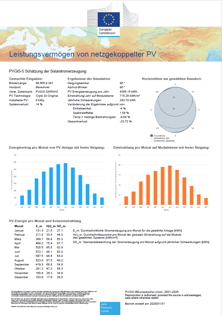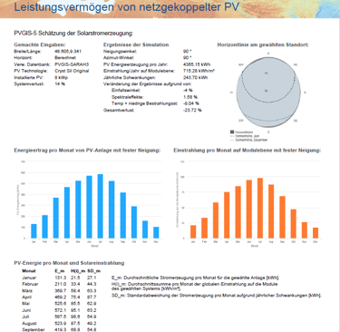 Auf der Seite JRC Photovoltaic Geographical Information System (PVGIS) - European Commission kann man die Berechnung noch etwas genauer durchführen und auch eine Kosten/Nutzen Rechnung machen.
