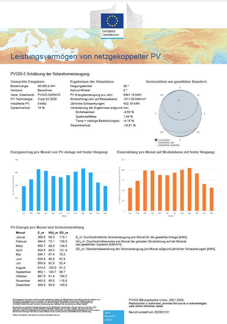 Auf der linken Seite ist die Berechnung für einen Südausrichtung und rechts für die Westausrichtung. Die Berechnung wurde mit dem Tool PHOTOVOLTAIC GEOGRAPHICAL INFORMATION SYSTEM der Europäischen Kommission erstellt und die Koordinaten vom Roßdorf verwendet. Trotzdem sind das natürlich nur Richtwerte da der tatsächliche Ertrag natürlich vom Wetter und der Beschattungssituation abhängig ist. Außerdem ist mit einem Batteriespeicher ein höherer Ertrag möglich.